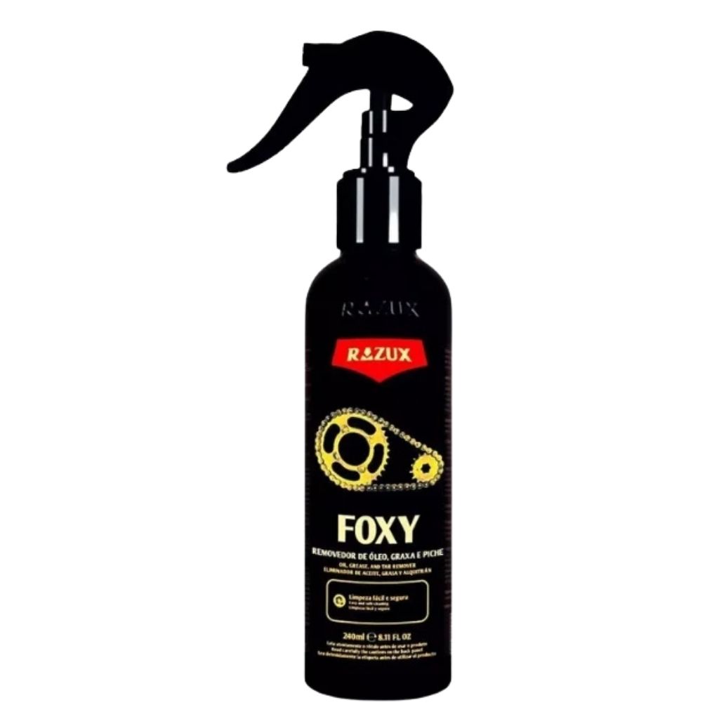O Foxy Razux Removedor 240ml foi desenvolvido com uma fórmula inovadora para a remoção rápida e segura de óleo, graxa e piche. É indicado para limpeza de motores, kits de transmissão, pintura e demais partes da motocicleta, proporcionando praticidade e eficiência.